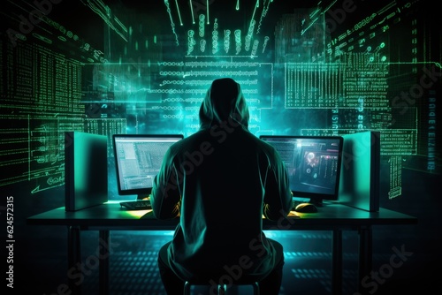 Silhouette of a man in a sweatshirt working on a computer with lines of code and binary digits around him, representing a hacker in action, Generative AI