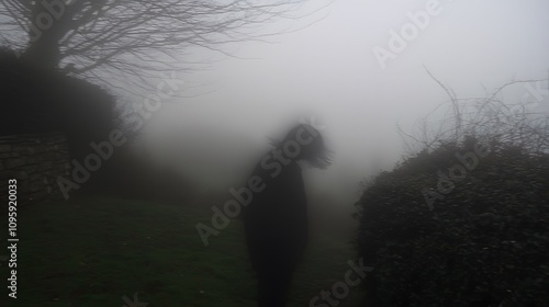 silhouette of a man standing in a foggy landscape, with the fog merging into the outline of his head, symbolizing connection with nature. The mist blurs the background of trees and shrubs, offering