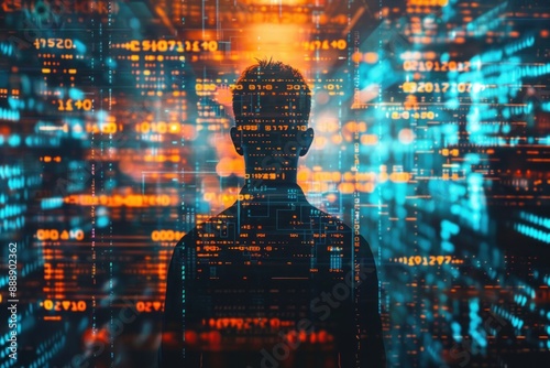 Silhouette of a software developer surrounded by a digital environment, with screens displaying code and development tools. The image highlights the complex and focused nature of programming and