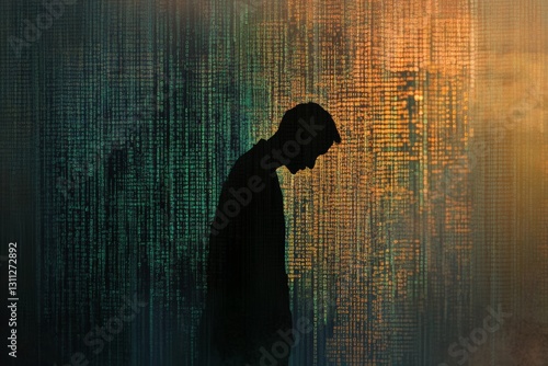 Silhouette of Man Against Digital Abstract Background in Evening Light