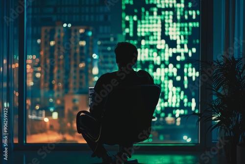 Silhouette of programmer working late in office, coding on laptop with cybersecurity binary code key