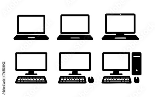 Silhouette set of laptops and desktop computers with keyboards and mice