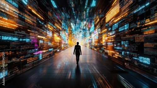 Silhouette walking through digital data stream