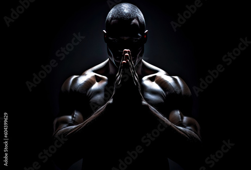 Silhouetted bodybuilder praying in the dark, ai generated artwork