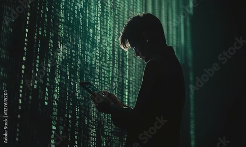 Silhouetted hacker unlocking mobile phone, dark background with binary code, personal data theft concept, mobile vulnerability