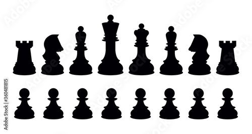 Silhouettes of chess pieces. Chessboard. Black and white. Chess icons. Vector chess isolated on white background. Playing chess on the Board. King, Queen, rook, knight, Bishop, pawn