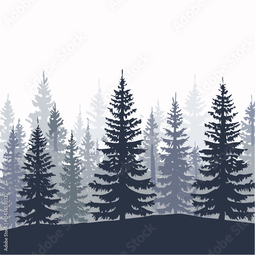 silhouettes of fir trees are set against a background of coniferous spruce pattern
