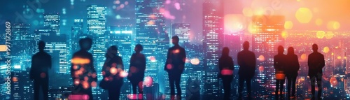 Silhouettes of people against a vibrant city skyline, showcasing modern urban life and nightlife amidst colorful lights.