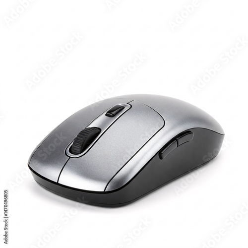 Silver and black wireless computer mouse with a scroll wheel, isolated on white