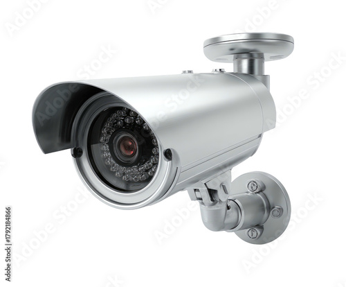 Silver CCTV camera, metallic case, hood, security, wall-mounted view