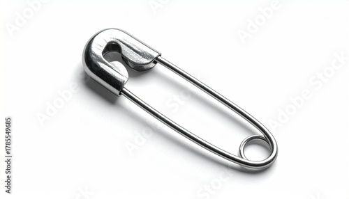 Silver safety pin, slightly angled, on white background