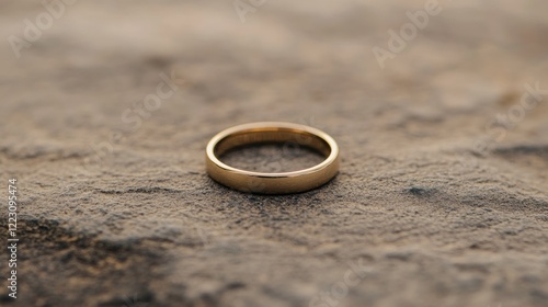 Simple gold wedding band rests on textured surface.