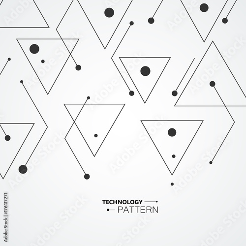 Simple pattern from triangles of lines and black dots, on white background. Designed for use in new technology projects. Simple, minimalistic, abstract background
