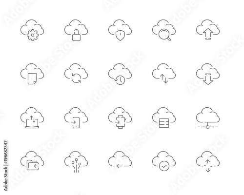 Simple set of Cloud computing vector line web icons. Contains such Icons as Data upload, Data synchronization, Cloud service and more. Editable Stroke. 48x48 Pixel Perfect.