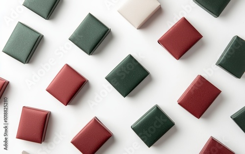 Simplified gift boxes in muted red and green, scattered randomly across a white background for a playful Christmas look