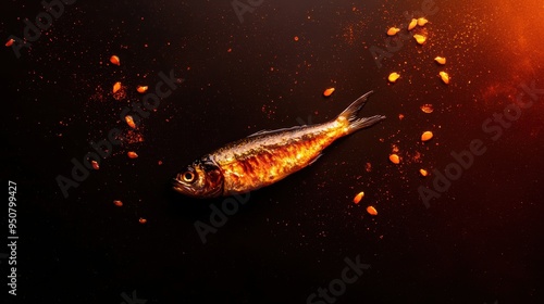 Single Roasted Fish on Black Background with Red Embers Scattered Around
