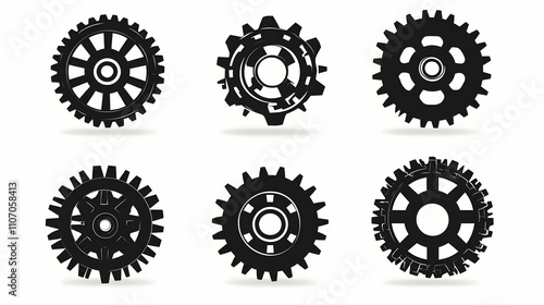 Six Black Gear Illustrations on White