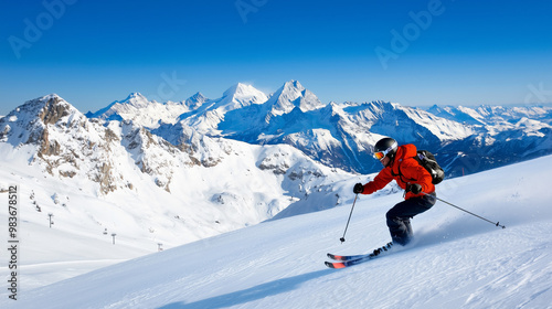 Skier Gliding Down a Slope with Majestic Mountain Views