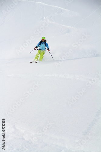 Skier in deep powder, extreme freeride