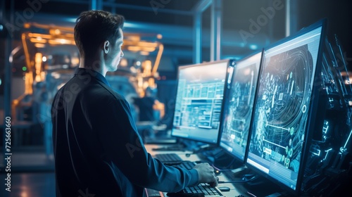 Skilled engineer operating a fully automated machine with programmable logic controller (plc) using laptop