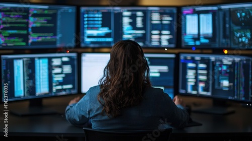 Skilled Female Programmer Working with Multiple Computer Displays