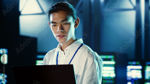 Skillful employee walking through data center systems providing processing resources for different workloads. Admin diagnosing server racks tasked with solving complex operations