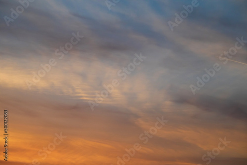 Sky background at sunset. Yellow clouds and blue sky