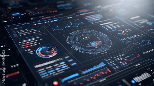 Sleek and modern business intelligence dashboard featuring virtual 3D data visualization and abstract technology elements showcasing key metrics insights