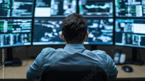 Sleek Futuristic Control Room with AI Technology and Multiple Screens Displaying Data Analytics