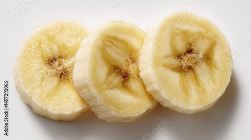 Sliced Banana: A close-up of three perfectly sliced bananas, revealing their creamy texture and appealing shape, is a testament to the simple beauty of natural food.