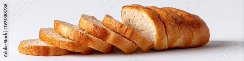 Sliced bread loaf partially stacked on white studio surface