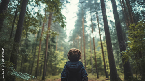 Small child explores a vast forest while feeling lost and alone under towering trees