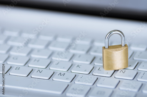 Small padlock sitting on white computer keyboard, online security concept