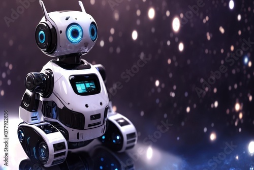 Small robot stands on a reflective surface surrounded by a starry background at nighttime