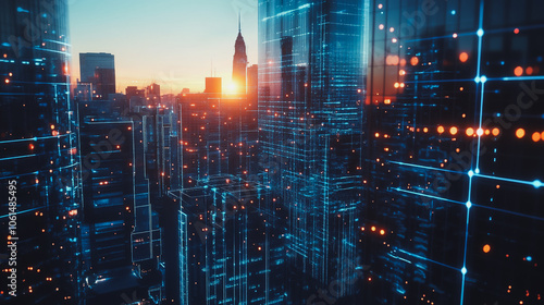 Smart digital city with connection cyber security network reciprocity over the cityscape . future smart wireless digital city and social media networking systems that connects people within the city
