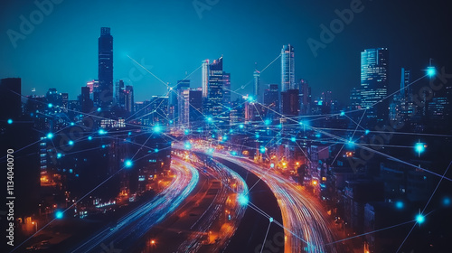 Smart digital Innovation city with connection network reciprocity over the cityscape. of future smart wireless digital city and social media networking systems that connects people with in city
