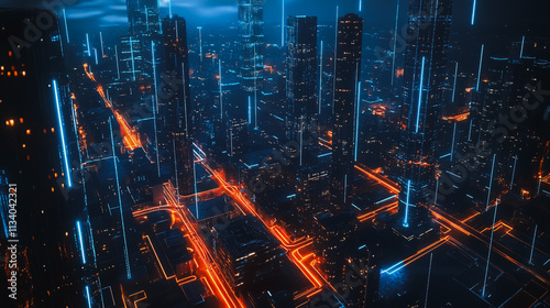 Smart digital Innovation city with connection network reciprocity over the cityscape. of future smart wireless digital city and social media networking systems that connects people with in city