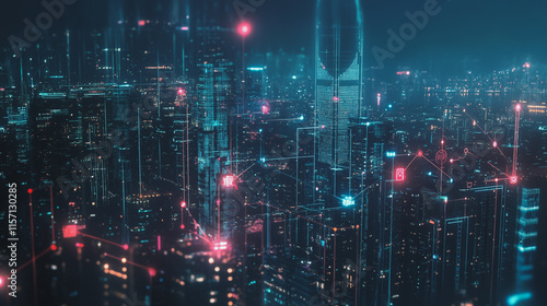 Smart digital Innovation city with connection network reciprocity over the cityscape. of future smart wireless digital city and social media networking systems that connects people with in city