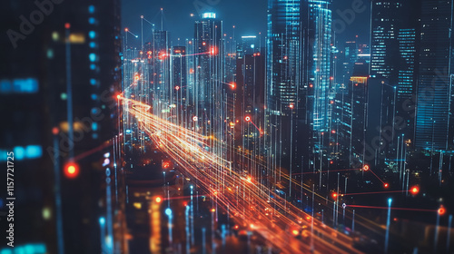 Smart digital Innovation city with connection network reciprocity over the cityscape. of future smart wireless digital city and social media networking systems that connects people with in city