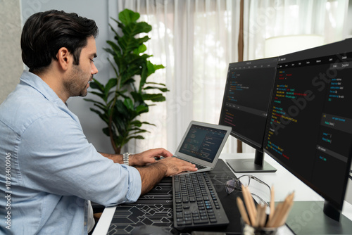 Smart IT developer working software development coding on laptop, creating application program update version online website on data's system two computer code pc screen at modern office. Surmise.