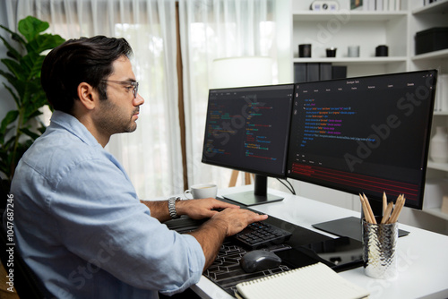 Smart IT developer working software development coding with creating application program update version online website on data's company system two computer code pc screen at modern office. Surmise.