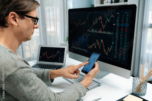 Smart stock investors pointing on screen with smartphone for market stock exchange along with laptop screen in highest dynamic investment rate, focusing data planning at modern workplace. Pecuniary.