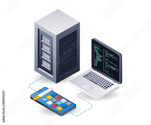 Smartphone application technology data server infographic 3d illustration flat isometric