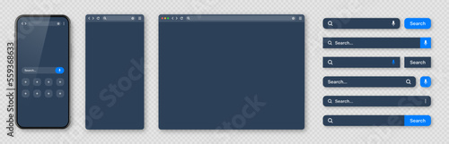 Smartphone, blank internet browser window and search bar templates, dark mode. Web site engine with search box, address bar and text field. UI design, website interface elements. Vector illustration