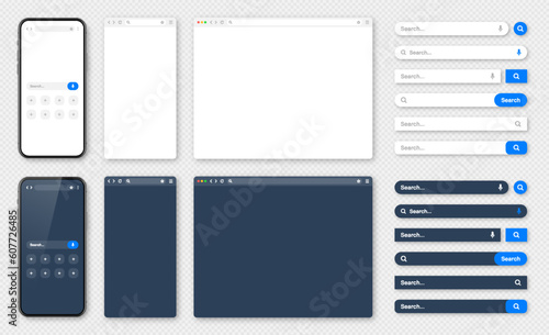 Smartphone, blank internet browser window with various search bars. Web site engine with search box, address bar and text field. UI design, website interface. Dark, light modes. Vector illustration