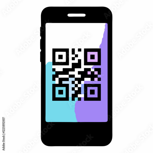 Smartphone display with QR codes in purple and blue on black screen, minimal vector. Concepts: digital access, QR code usage, smart technology, scanning interface, event ticket, contactless ID, fintec