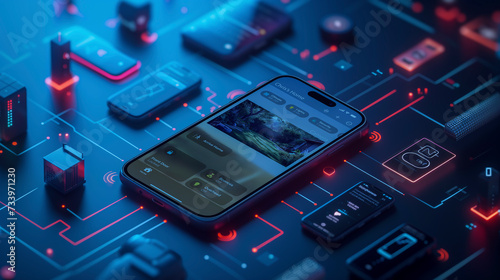 Smartphone displaying a smart home control interface, surrounded by glowing tech gadgets on a digital circuit background.