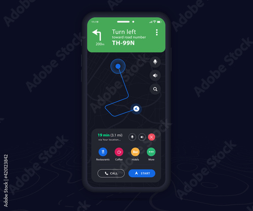Smartphone map GPS navigation app dark mode ux ui concept, Mobile map application, App search map navigation, Technology map, City street navigation maps, gps tracking, App dark mode, Vector
