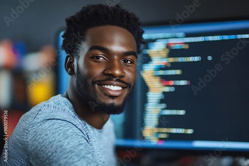 Smiling African American programmer working at his computer with code on the screen. Concept of software development, technology, coding, and IT.