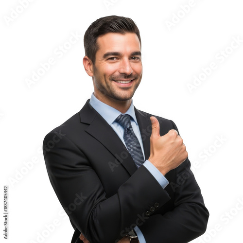 Smiling businessman in a dark suit and tie giving a thumbs up gesture of approval and success isolated on transparent background